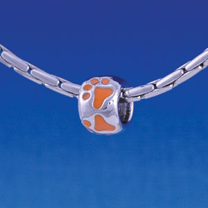 B1127 tlf - Silver Bead with Orange Paw Prints - Im. Rhodium Plated Large Hole Beads