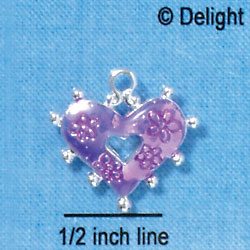C2932+ - 2 Sided Hot Purple Enamel Heart with Flowers - Silver Charm