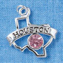 C3056 - "Houston" Outline Texas with Large Light Pink Swarovski Crystal Stone - Silver Plated Charm